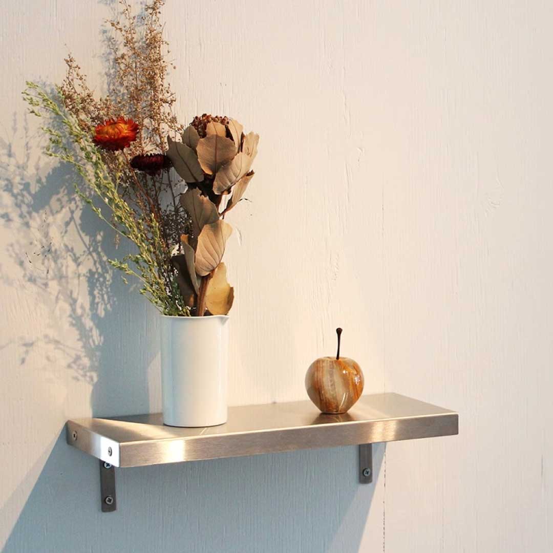 奥行き12cmの木材にかぶせるだけで、ステンレスのような質感の棚に変わるシェルフカバー。DIY感覚で手軽に取り入れられ、空間にクリーンな印象を加えてくれます。