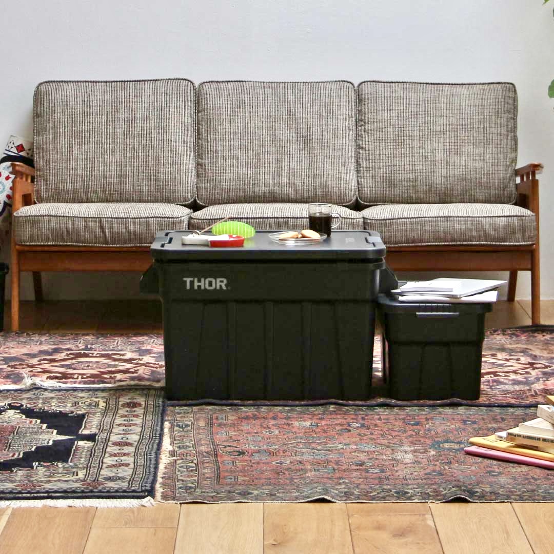 THORラージトートとトップボードを組み合わせれば、収納がそのままテーブルに。置き場所を取らず、必要なときだけ天板をのせるシンプルな使い方で、空間に余白が生まれます。
