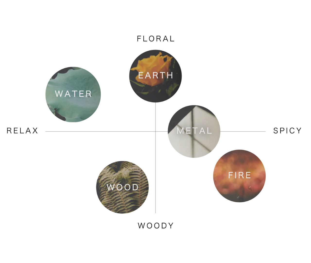 陰陽五行という古代の東洋思想が、こんなにも現代的で洗練されたインテリアフレグランスとして表現されることに驚かされます。火を灯すたび、私たちは自然と、そして自分自身と再び繋がることができるのです。