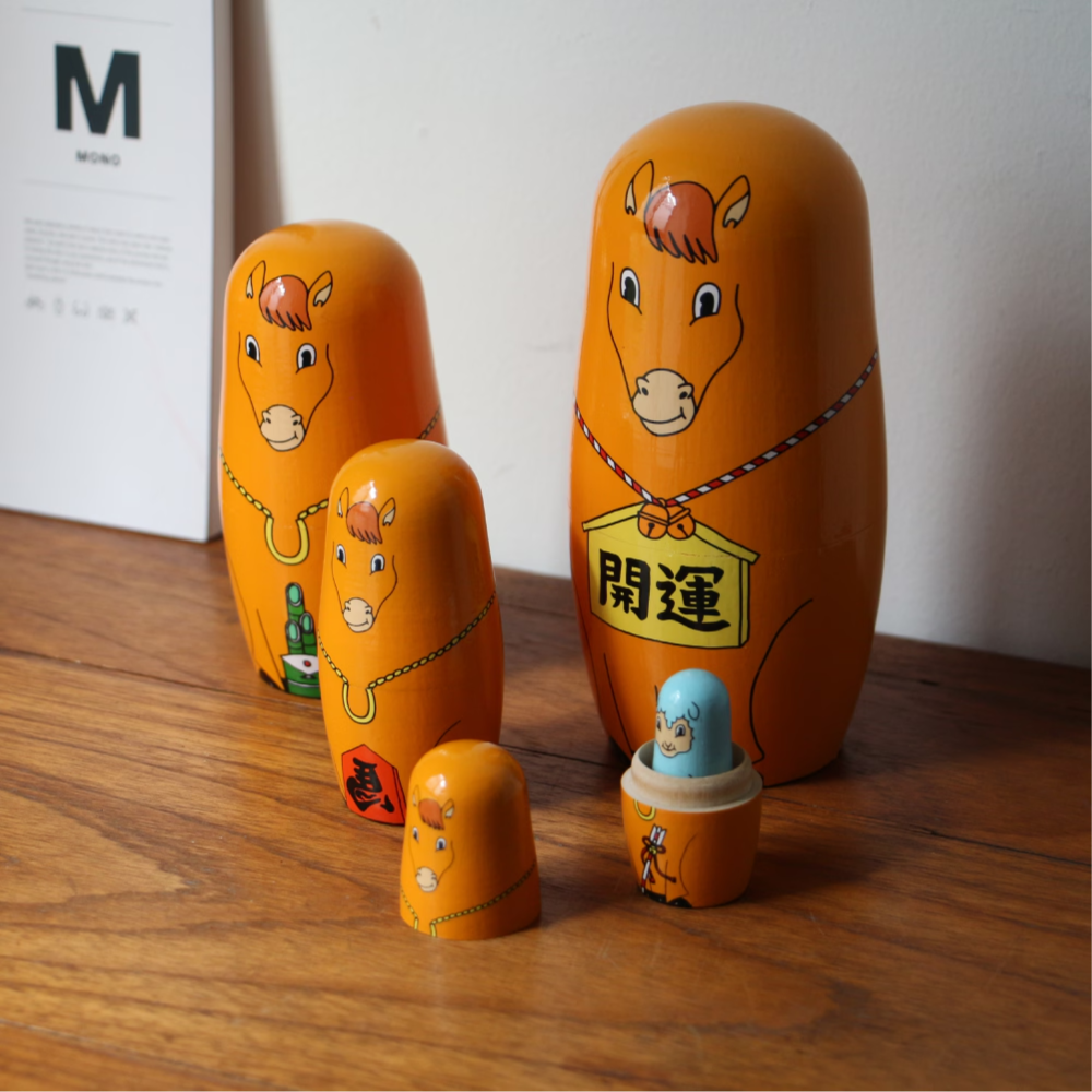2026年の干支の馬をモチーフにしたマトリョーシカ「Happy New Horse」。層になった入れ子の構造で一緒に飾っても、玄関やリビングなどに一体ずつ別々に飾っても楽しめます。